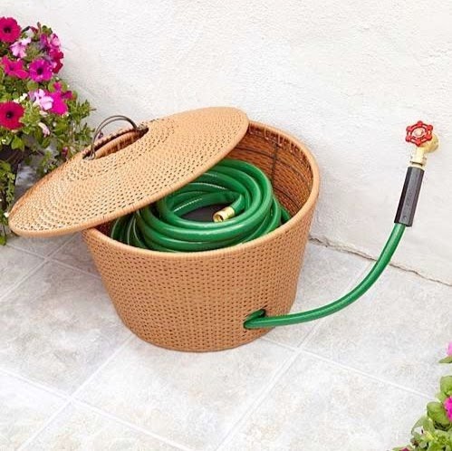 Uma boa dica para organizar a mangueira, esconder e ainda decorar o seu quintal é utilizar objetos redondos como cestos, baldes ou pneus.