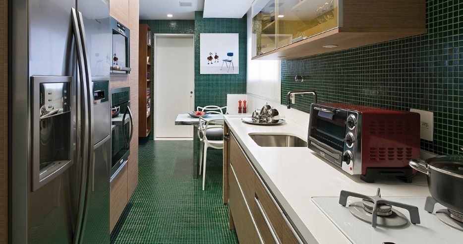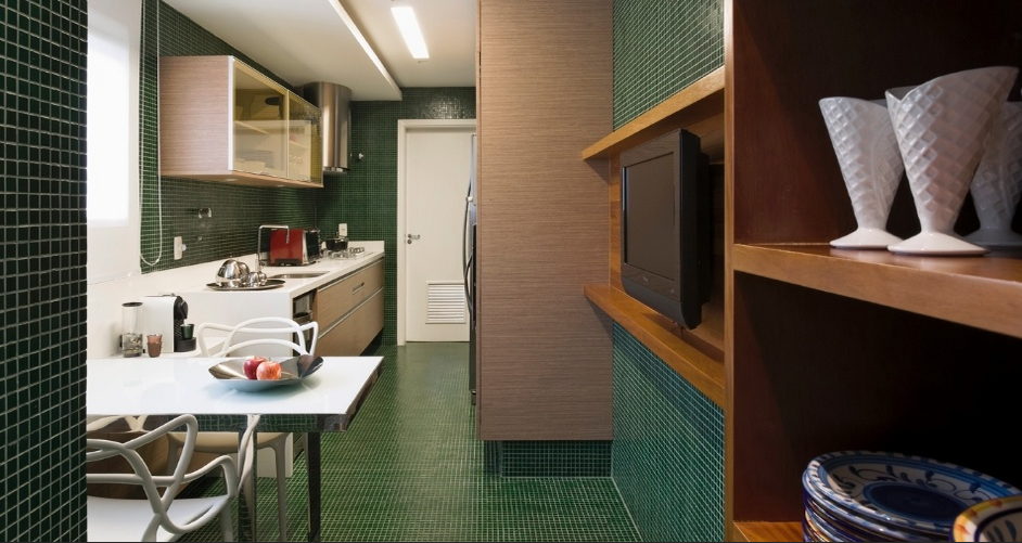 O arquiteto usou a pastilha revestindo paredes e piso, dando a sensação de que a cozinha é uma caixa, uma enorme caixa verde. O uso de móveis de tons neutros ficou super harmônico e não deixou o ambiente pesado, muito pelo contrário, contribuiu para manter o foco nas pastilhas.