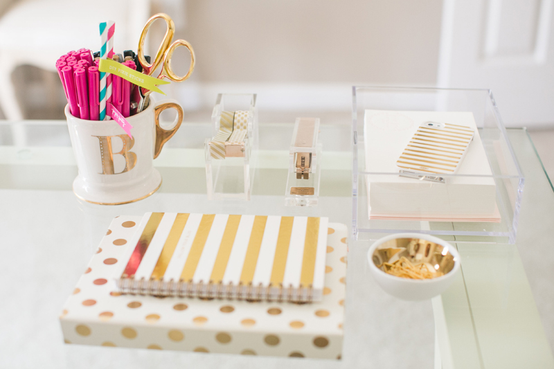Outra dica é inserir o dourado no escritório, mas de novo, somente apostar em detalhes como caixinhas organizadoras, abajures, quadrinhos, bandejas e etc.
