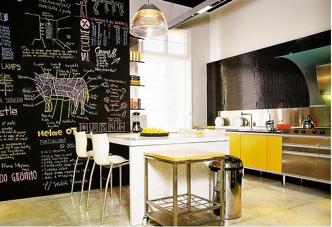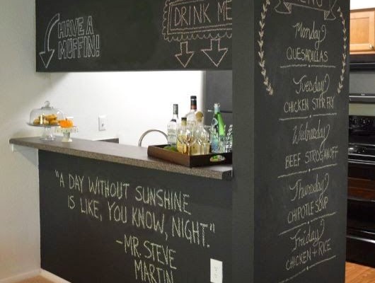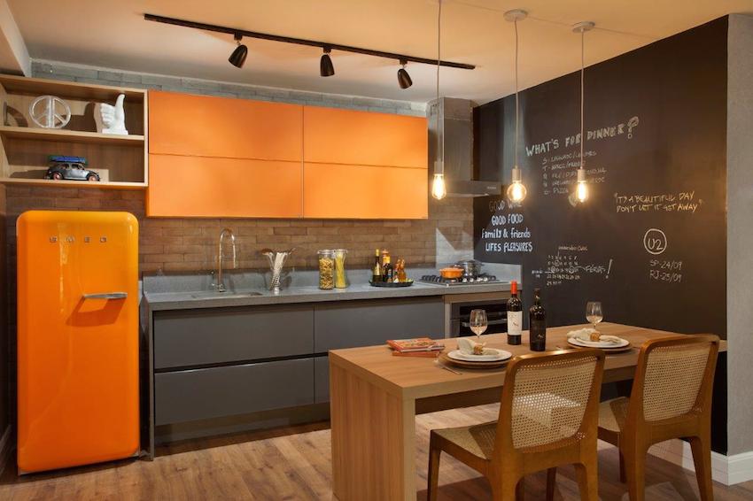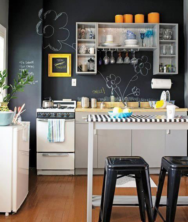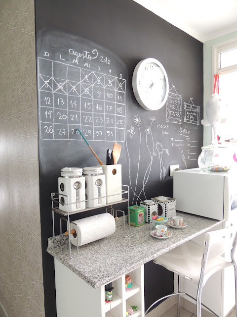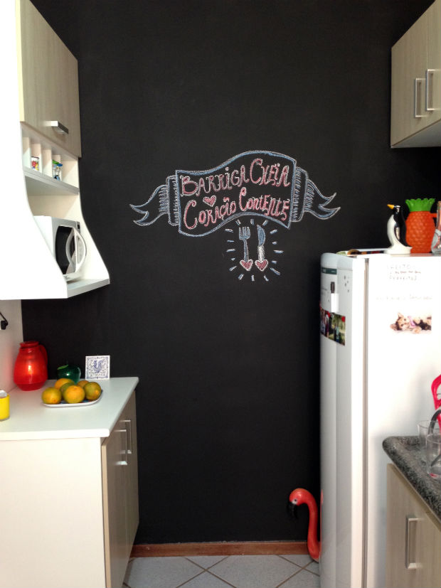 Você já deve ter visto nas cozinhas mais modernas que está em alta fazer uma parede lousa ou pelo menos um espacinho onde se possa desenhar, escrever receitas e até recadinhos. Essa prática muda a decoração da cozinha sempre que alguém faz uma arte diferente nas paredes.